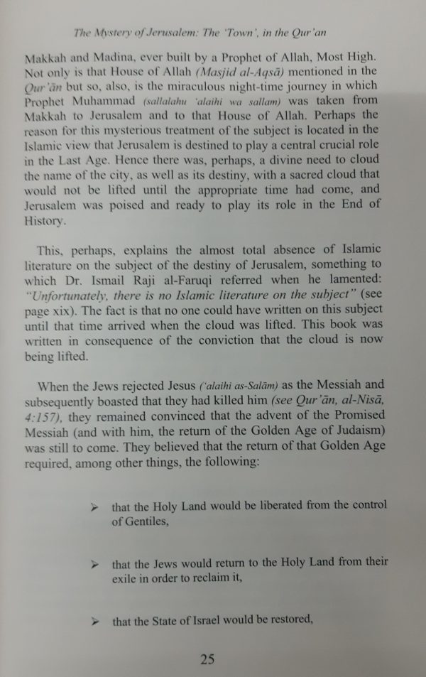 Jerusalem in the Qur’an is a great book that thrilled and delighted me in a number of ways. I am surprised that such a meticulously documented book had to wait for such a long time before seeing the light. It is now more than half a century since the Zionists began their appalling oppression and ethnic cleansing of the Palestinian people whose only offense is that they happened to live in a country considered by the Jews to be their promised Holy Land.