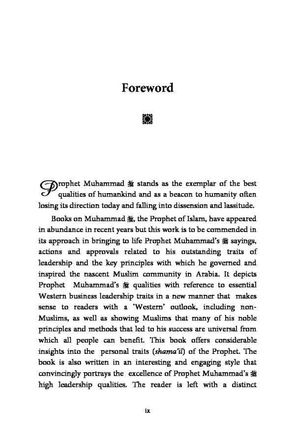 “This book depicts Prophet Muhammad’s صلى الله عليه وسلم qualities with reference to essential Western business leadership traits in a new manner that makes sense to readers with a ‘Western’ outlook, including non-Muslims, as well as showing Muslims that many of his noble principles and methods that led to his success are universal from which all people can benefit. This book offers considerable insights into the personal traits (shama’il) of the