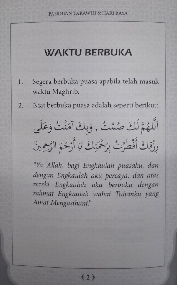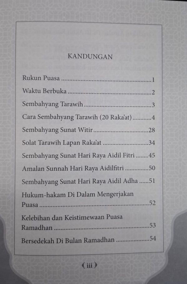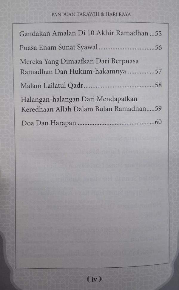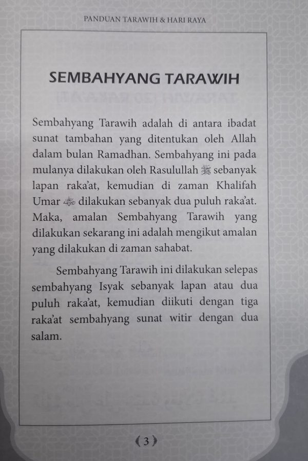 “Panduan Tarawih & Hari Raya” adalah sebuah buku yang menyediakan panduan lengkap mengenai ibadah Tarawih sepanjang bulan Ramadan dan amalan Hari Raya. Buku ini mengajak pembaca untuk memahami tata cara solat Tarawih yang betul serta doa-doa yang dianjurkan, di samping memberi panduan mengenai persiapan dan sambutan Hari Raya dengan penuh makna. Dengan bahasa yang mudah difahami, buku ini sangat sesuai untuk semua golongan, membantu mereka menghayati ibadah dan merayakan Syawal dengan lebih bermakna.